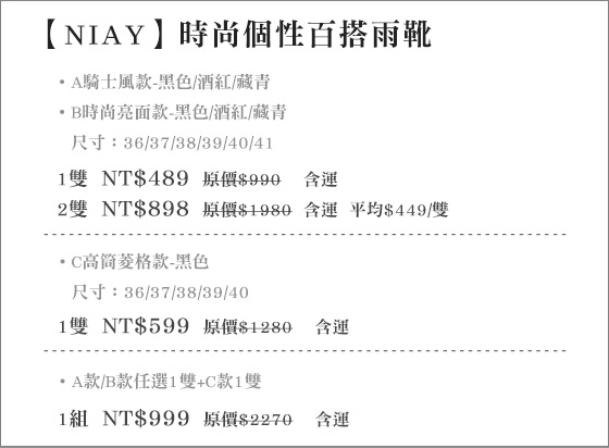 ![]() 防絨加密100%純棉枕套/防絨100%純棉羽絨柔絲枕 售價:169 我要購買 防絨加密100%純棉枕套/防絨100%純棉羽絨柔絲枕-新研發!纖維枕不夠看,快升級純棉防絨加密的羽絨枕系列!水洗防菌,蓬鬆透氣,享受整晚舒適好眠!只要169元起(含運)即可購得原價最高2700元可水洗 | ![]() 珍腸一生-香腸系列 售價:74 我要購買 珍腸一生-香腸系列-檔檔破千熱賣!你吃過了沒?採用100%自製純豬油塊,食用超安心!獨特傳統新滋味,口口皆是肥美鮮甜!只要74元起即可購得【珍腸一生】原價最高1600元香腸系列:(A)風味香腸1包(2 | ![]() 嵐町目日式拉麵-套餐方案 售價:299 我要購買 嵐町目日式拉麵-套餐方案-天冷就來嵐町目吃拉麵!以新鮮食材烹調出每一道美味佳餚,拉麵湯頭濃香醇,入喉就是點滴溫暖浸心頭!只要299元起即可享用【嵐町目日式拉麵】原價最高1175元套餐方案:(A)雙人日 |