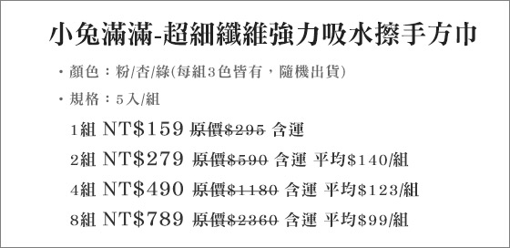 一直以來我都很相信LAURA推荐的東西。網路購物EC是擋不住的趨勢,可以方便比價只要用功通常都能買到相對便宜的商品!小兔滿滿-超細纖維強力吸水擦手方巾數量有限,售完為止!限量是殘酷的,不要猶豫入手要快~LAURA最近也對這個商品很感興趣,要到處比價;尋找低價及可靠的網購地方!