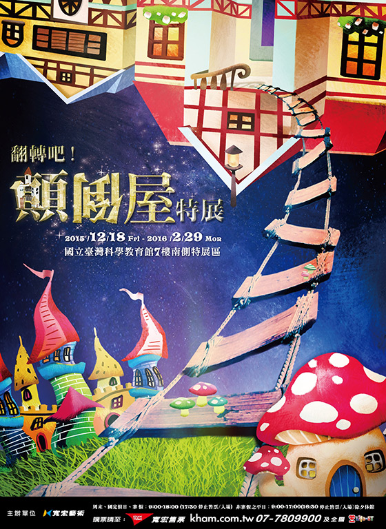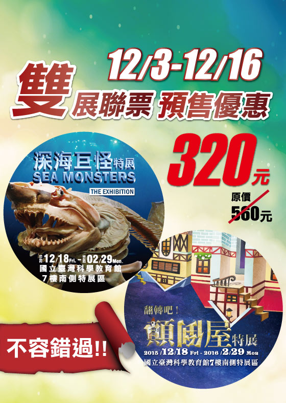 ▶ [ 顛倒屋:180度大翻轉!挑戰重力極限! ] 蝦米?!房子顛倒啦!《顛倒屋特展》打破房屋空間迷思,重新定義顛倒玩法!首度顛倒呈現房屋剖面,屋脊、梁柱倒立看透透!還有霸氣歐風設計震撼視覺!發揮你的創意,拍出Kuso飛簷走壁、太空漂浮照片,你有勇氣跨出那一步嗎? ![]() ▶ [ 遊戲樹屋:原來樹屋可以醬好玩! ] 雙層樹屋獨家推出!進入神祕樹洞一起穿梭探險,超大版的花草環繞四周,巨大瓢蟲跟你作伴!樹屋達成童年想像,通過森林吊橋、一躍而下五顏六色的海綿球池、在遊趣攀爬網爬上爬下,還有超酷雨中鞦韆!樹屋玩很大,一日體驗玩樂滿分! ![]() ▶ [ 哈哈屋:我也要一起歪七扭八! ] 房子也會跳舞?無限扭曲的哈哈屋不論窗戶、大門,通通都變形啦!進入哈哈屋,哈哈鏡不停扭動,你也跟著一起放大、縮小、左扭、右擺,對著鏡子哈哈大笑!還有鏡屋迷宮等你挑戰,影像反射層層疊疊,左右虛實看清楚,別迷路囉! ![]() ▶ [ 蘑菇屋:什麼?蔬菜也能變房子? ] 童話不是夢!你有看過蘑菇屋嗎?《顛倒屋特展》讓你進入故事之中,入住可愛蘑菇屋,蘑菇家具一字排開,蘑菇桌椅、蘑菇床,點點也瘋狂!還有不時變換顏色的大蘑菇等你發現其中奧妙!一起亂入蘑菇異想世界吧! ![]() ▶ [ 小矮人屋:矮人生活大揭密,歪腰請進門 ] 135公分以上進入請低頭!天花板怎麼可以那麼低?《顛倒屋特展》邀請你一窺小矮人舒適的生活空間,麻雀雖小五臟俱全,書桌、櫥櫃、暖爐,小矮人的足跡一一呈現,你也可以體驗小矮人的日常生活,但是小心別撞到頭喔! ▶ [ 糖果屋:棒棒糖大驚奇! ] 巨無霸棒棒糖隧道帶你溜進夢幻童話世界!結合展覽童話主題,《顛倒屋特展》特別推出繽紛糖果屋販售部,除了餅乾、蛋糕造型牆面,還有一根一根繽紛超大版棒棒糖圍繞酷炫滑水道!甜蜜滿分、玩樂破表!想舔一口棒棒糖嗎? =展覽資訊= 展覽名稱:顛倒屋特展 展覽日期:104年12月18日(五)至105年2月29日(一) 展覽地點:國立臺灣科學教育館七樓南側特展區(台北市士林區士商路189號) 展覽時間:週六日、國定假日、寒暑假09:00-18:00(17:30 停止售票及入場/除夕休館) 非寒暑假之平日09:00-17:00(16:30停止售票入場) 主辦單位:寬宏藝術經紀股份有限公司 票種說明: 1.免票入場:90 公分以下或 2 歲以下兒童 2.幼童票160元:限2歲~未滿6歲或90~115公分幼童(需出示證件,未攜帶者身高判別) 年齡計算以年為計算標準 民國104年入場則以民國102年(含)以後出生視為免票,民國98~101年出生視為幼童票; 民國105年入場則以民國103年(含)以後出生後視為免票,民國99~102年出生視為幼童票 3.學生票240元:限持本國大專以下有效學生證件,民國104學年以上學期註冊章為憑,入場需驗證(不含碩士生、空中大學、推廣教育、社區大學) 4.敬老票140元:限65歲(含)以上長者,民國40年(含)以前出生者,需驗證 5.身障人士與陪同票140元:身障人士需驗證(包含一名陪同者) =注意事項及入場須知= 一、每張票券展期間可使用一次,票券一旦遺失、毀損,恕不補發退換,請妥善保管。 二、本展覽相關異動訊息公布或票務相關事宜,可隨時於寬宏售票系統www.kham.com.tw查詢獲得第一手資訊,恕不另行通知。 三、本展覽開放拍照攝影,惟請尊重藝術家之智慧財產權及作品版權所有。 四、禁止攜帶傘、食物、飲料、寵物入場;禁止飲食、吸菸、嚼食口香糖及檳榔。 五、為維持展館動線流通,請將兒童手推車置於展館外,個人物品請自行保管,本展不提供寄放。 六、請遵守參觀規則、動線及現場工作人員指示,如遇人潮眾多,敬請依序排隊等候。 七、請勿高聲談笑、嬉戲追逐及觸碰展品。如有不當行為經規勸無效者,則須立即離場且不得有異議。 ![]() 「鯨鯊」到底是鯨魚還是鯊魚? 烏龜居然會流眼淚?加拿大展出時廣受好評的「深海巨怪特展」將百件珍貴的深海生物,首度透過塑化技術做成標本,不只是展出海洋生物的外在風貌,而是從內在器官來解析生物演化的過程,揭開深海奧秘,發現海洋多樣生物性與其內部構造之美! ![]() 百件深海生物標本,從鯨魚、鯊魚到海豚,海洋生態一覽無遺 展出內容包括數十件被稱之為世界上最大的哺乳動物,鯨魚的塑化標本、以及鯨魚體內各種器官,揭開了鯨魚的生理結構和獨有的生存繁衍本能。追溯史前鯨魚的起源,從國內外大量化石的發現中,科學家找到了鯨魚的祖先從陸地返回海洋的原始證據,從而揭開鯨魚演化和發展的密碼。 ![]() 除了令人驚奇的鯨魚塑化標本外,其他展出的海底生物品種超過100種,還有其他與鯨魚共存的海洋動物塑化標本,如此之多的體型巨大、種類繁多的海洋生物塑化標本,堪稱是國內陳列展覽中的首創。 ![]() 傳遞海洋生態保育與自然和平共融的訊息 運用燈光、投影等現代陳列設計手段,生動再現浩瀚的海洋哺育著形形色色的海洋生物,再現各類鯨魚及深海中其他生物群體在海中生活和生存繁衍的真實場面。透過生物塑化保存技術,讓前來的觀眾不僅可近距離觀看逾百個神秘的海洋生物標本,還可以透過有別以往的展示方式,觀察到以往難以接觸的到內部構造,這些充滿神秘感的深海動物標本透過近距離的觀察和探索,將能激發觀眾的想像力,瞭解世上最難以捉摸和奇特的深海巨型生物。 ![]() 這些長相奇怪的海洋生物自古以來擁有許多亦真亦假的歷史傳聞,人類們曾一度因為不了解而害怕牠們,將牠們視為具有危險性的海怪。但經過多年的